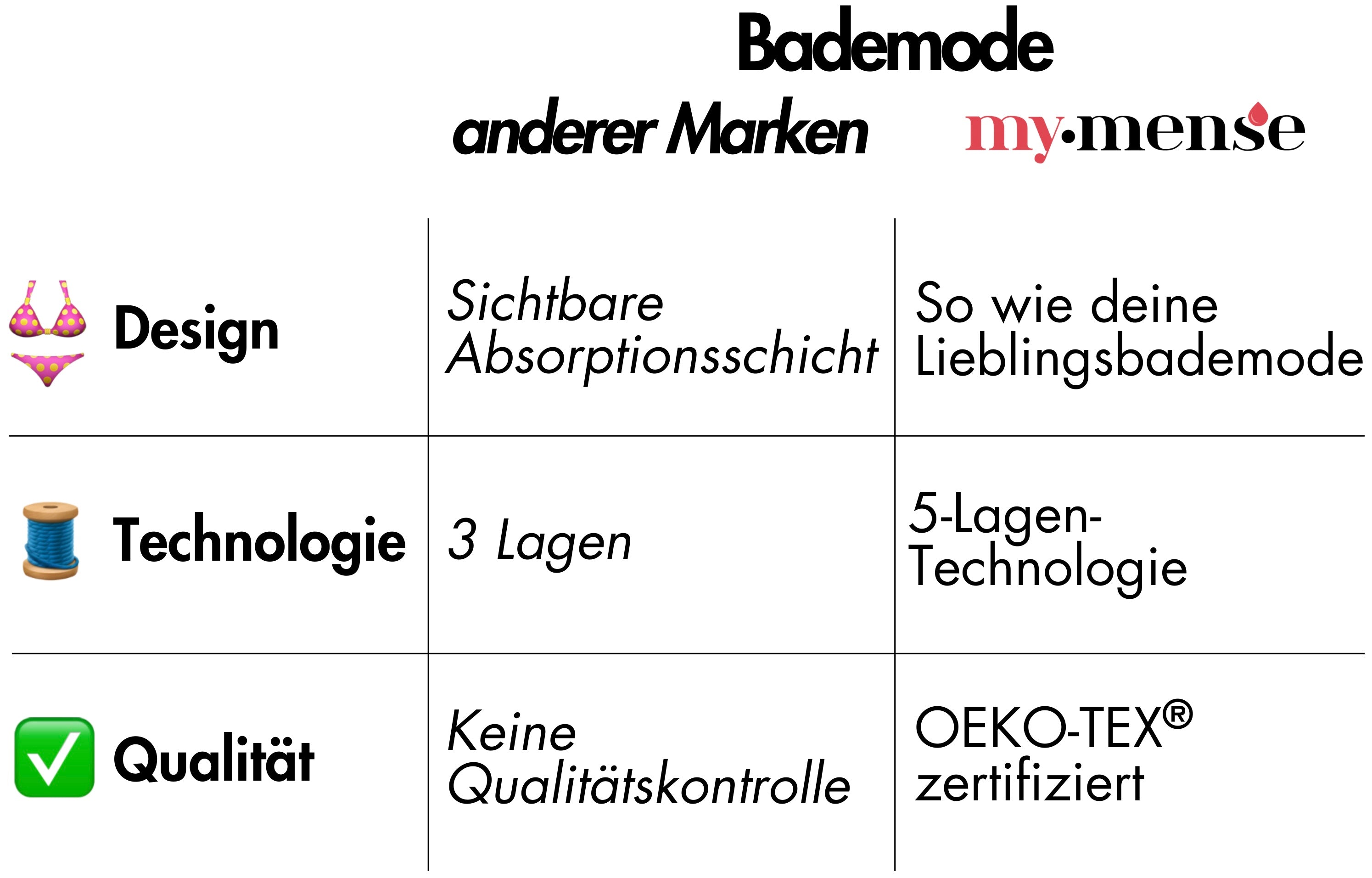 Periodenbademode sieht aus wie ganz normale Bademode – kann aber viel mehr. Sie enthält eine speziell entwickelte Schutzschicht, die das Menstruationsblut zuverlässig auffängt. Diese besteht aus mehreren cleveren Hightech-Schichten: